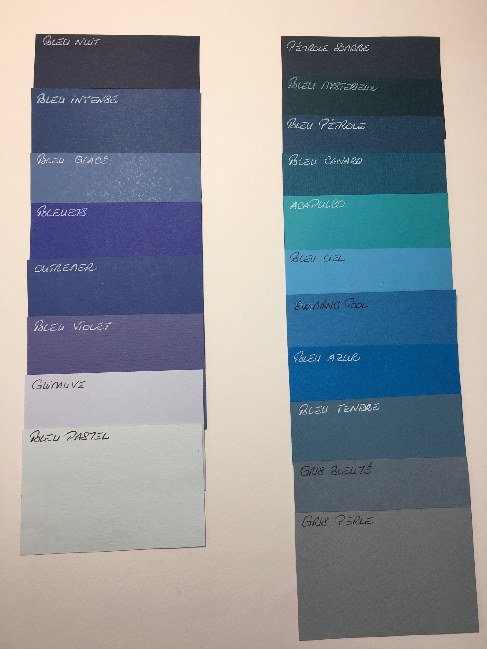Pour la version Bleu/ vert: vert d'eau, bleu clair, bleu marine, menthe fraîche.