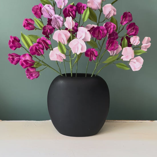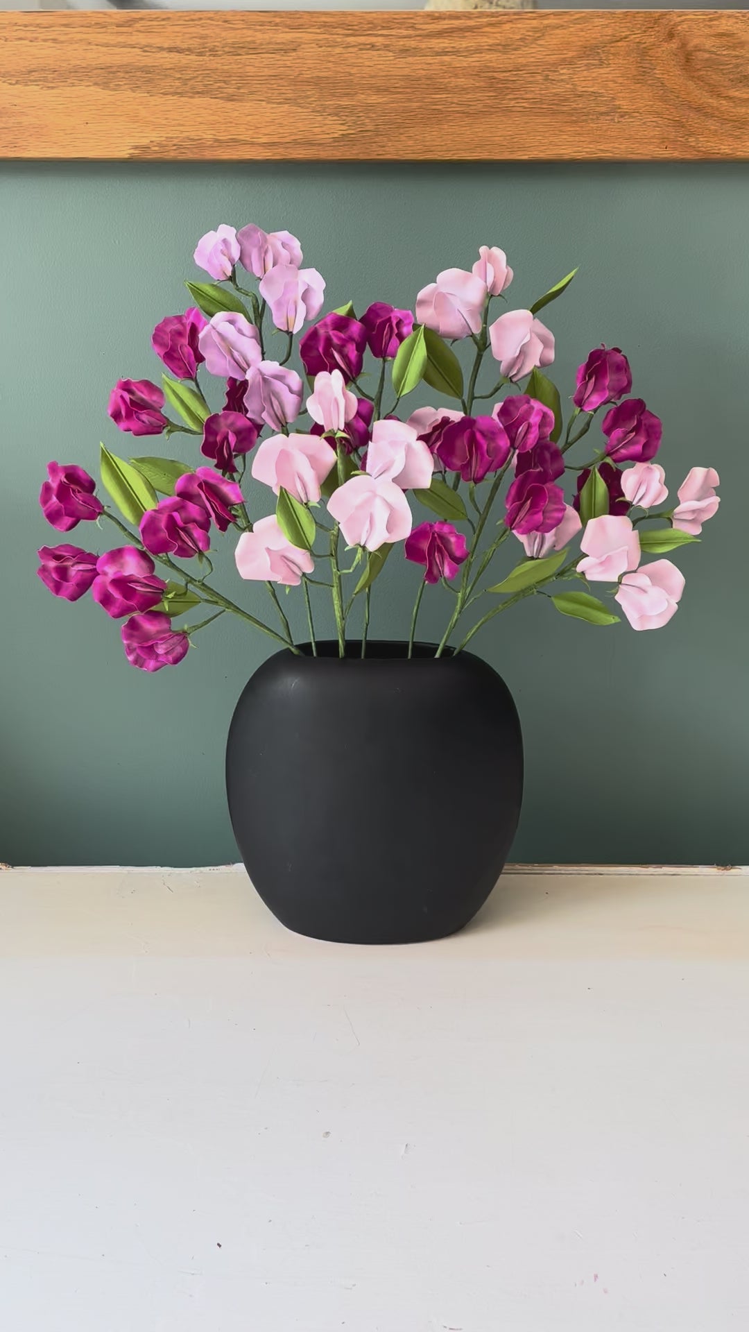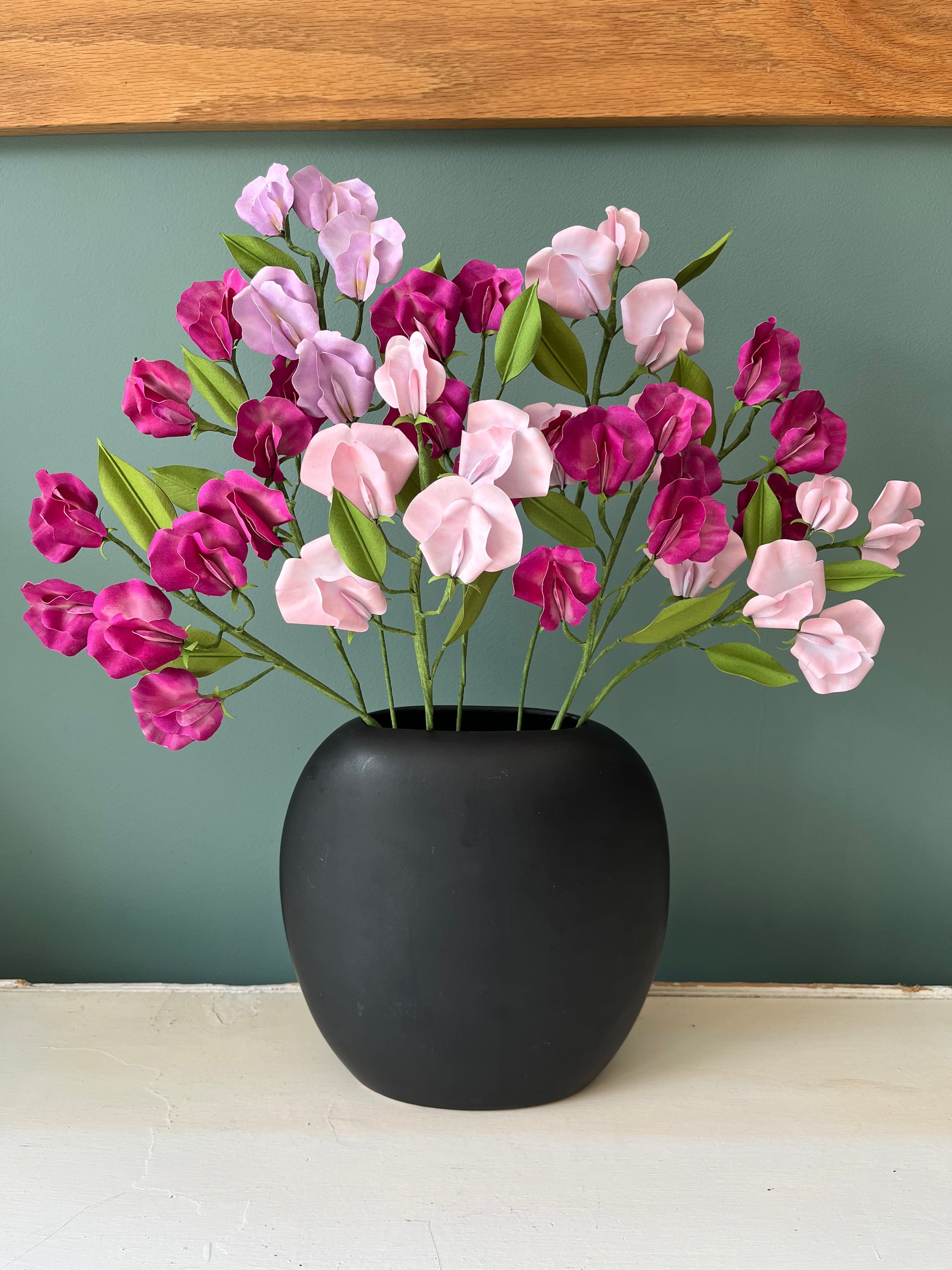 J'utilise un papier de qualité, teinté dans la masse, donc résistant à la lumière. Certaine comme ces pois de senteur ont également un vernis stabilisateur qui permettront à la couleur de garder son intensité plus longtemps. Cependant, il est préférable de ne pas laisser le bouquet derrière une fenêtre en plein soleil.