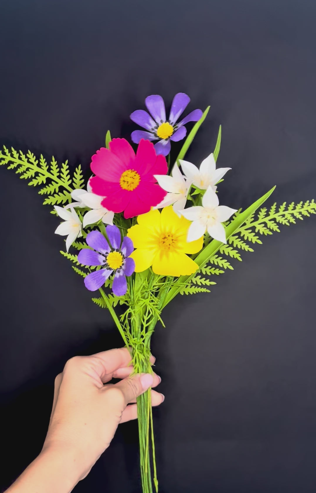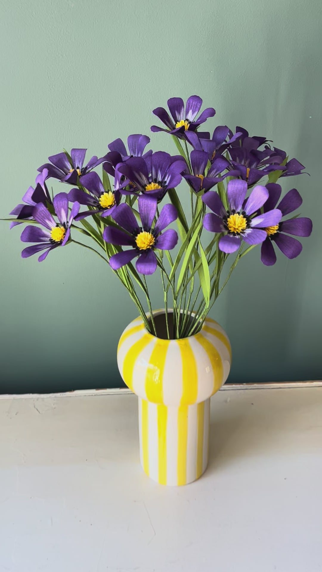 J'utilise un papier de qualité, teinté dans la masse, donc résistant à la lumière. Certaine comme ces fleurs violettes, ont également un vernis stabilisateur qui permettront à la couleur de garder son intensité plus longtemps. Cependant, il est préférable de ne pas laisser le bouquet derrière une fenêtre en plein soleil.